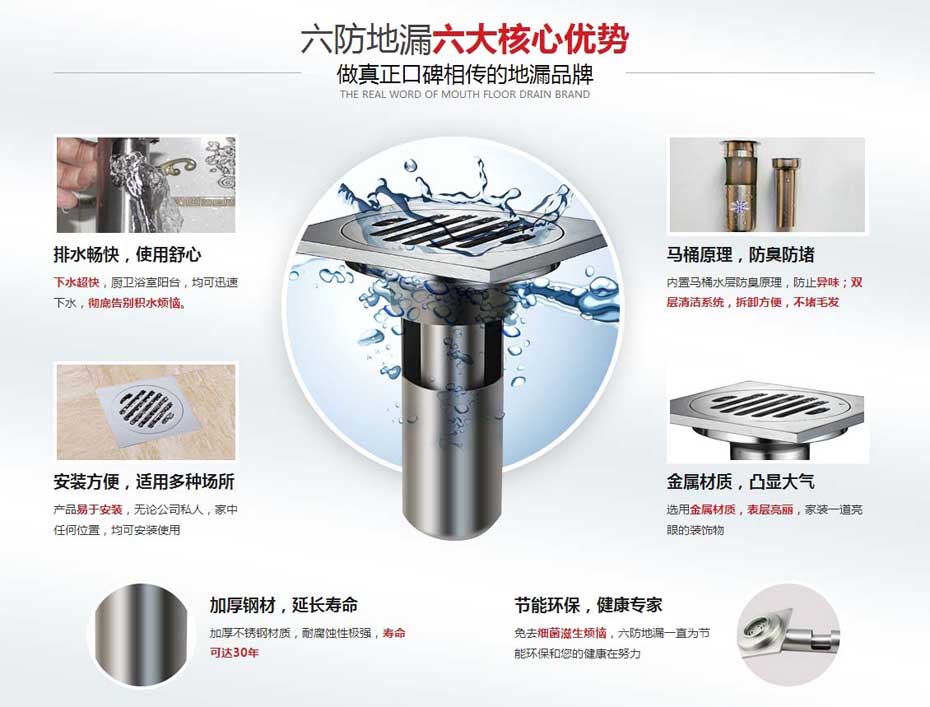 1、我們熟知市場的需求,并通過我們對地漏的了解設計了眾多蜚聲海內外的地漏款式,不斷引領地漏時尚風潮并被無數廠家“追捧”。 2、我們與國內眾多一流的裝飾公司達成戰略合作伙伴關系包括東易日盛、業之峰、元洲、實創、闊達等等全國各地知名大型裝飾公司。 3、我們的產品在眾多世界級的建筑上得以應用,包括鳥巢、水立方、上海世博場館等等各地著名建筑。 4、自2006年至今到未來通過我們全體同仁的未變目標矢志不渝地堅持已經開創了地漏這個行業的新的時代. 六防品牌在全國已經形成了非常良好的品牌效應。 |