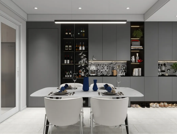 一通到頂?shù)墓耋w,充分利用每一寸空間,開放柜與收納柜相結(jié)合,驪住定制收納實(shí)現(xiàn)柜體的多功能實(shí)用性。