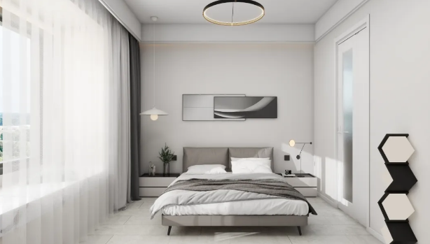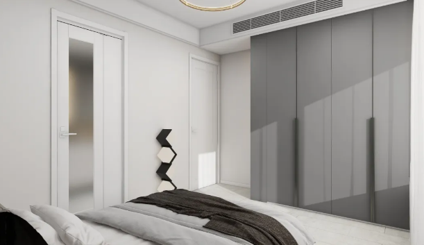 主臥空間設(shè)計(jì)以簡潔為主,空間中除了設(shè)置了一套驪住定制衣柜用來滿足居者收納需求外,不做過多裝飾,整潔明亮。