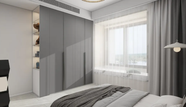 驪住定制衣柜的設(shè)計(jì)形式與次臥相同,同時(shí)在窗戶一側(cè)做開放隔板式的驪住收納柜,有效利用空間增大收納量。