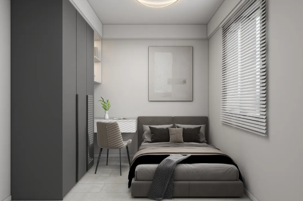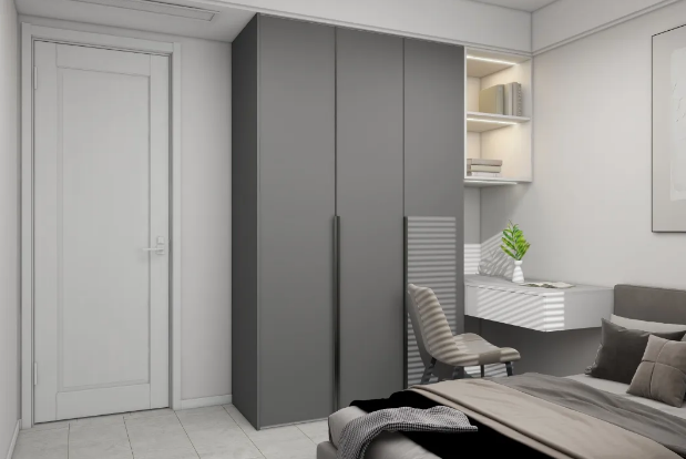 中灰色通頂驪住定制衣柜與漆白色定制書柜書桌做結(jié)合式設(shè)計(jì),一體式設(shè)計(jì)將拐角空間也利用上,增大空間收納量。