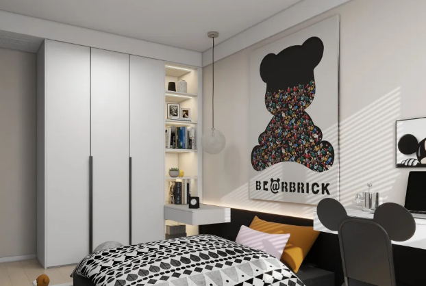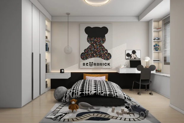 兒童房面積不大但整體色調(diào)上遵循整屋配色,搭配童趣元素,來襯托氛圍感。