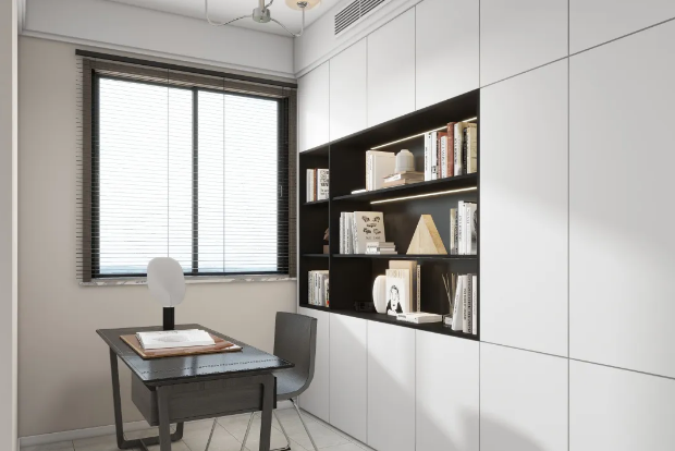 為營造寬敞的視覺感受,驪住全屋定制依墻定制整面書柜,書柜中部做隔板式收納設(shè)計(jì),方便取放常用書籍;周邊做隱藏式收納設(shè)計(jì),視感利落,藏露有致的設(shè)計(jì),實(shí)用而又有空間層次感。