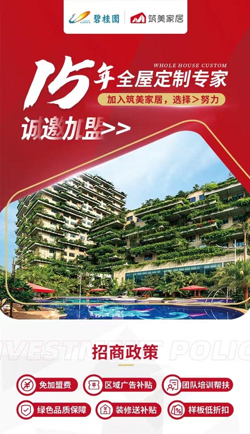 即日起,碧桂園筑美家居2022整家新勢力招商活動正在全國火熱進行中。基于疫情原因,筑美家居還將于3月28日開啟線上招商直播,敬請志同道合者關注筑美家居微信公眾號、視頻號,或致電400-0197-808垂詢,進一步了解筑美家居的盈利模式與財富之道,共筑真整家億萬市場!。