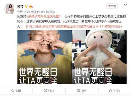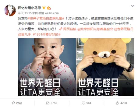 4月21號,為迎接今年“世界無醛日”的到來,北京新陽光慈善基金會在微博上發(fā)布愛心海報,發(fā)起#按鼻子救助白血病兒童#公益活動,呼吁全民關注白血病兒童,提倡健康生活方式。該公益活動一公布,便獲得眾多網友關注和轉發(fā),其中不乏知名博主“回憶專用小馬甲”、“留幾手”等的強力支持。
