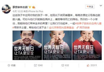 在娛樂界,更有超高人氣的臺灣藝人林志穎等積極響應,用自己按鼻子的照片,呼吁大家一起來為白血病兒童加油,支持兒童白血病公益活動。有網友表示,“每次看到他們因身患重癥而消瘦的面孔,我就的眼淚就忍不住了!”,更有網友呼吁“維持隊形,和林爸比一起按鼻子,支持救助白血病兒童!”