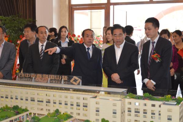 人大主任王俊峰、政協主席吳忠孝、副縣長趙振林、國土局局長張德順、發改委局長田國平、市監局局長李鳳春參觀項目沙盤模型。