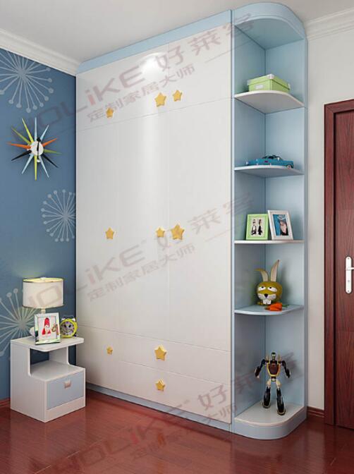 掩門衣柜的存在,為孩子的衣服被褥、玩具等保留了存放空間,柜門的星星點綴,增加了幾分童趣,一側的擱板置物層,增加了空間的靈動感。 |