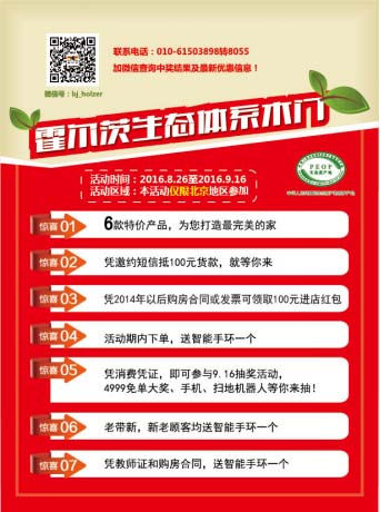 8月26日—9月16日,霍爾茨隆重啟動了以“購生態,享生活”十一北京大型活動,以嚴苛的品質產品為北京的消費者謀生態福利,打造健康、安全的生態家居生活;顒悠陂g,7大驚喜活動震撼來襲,6款特價產品、以邀約短信抵購物貨款、送不停的百元紅包、免單大獎抽取機會……開啟了鉅惠盛宴,為每一位消費者帶來極致性價比,樂享生態生活。