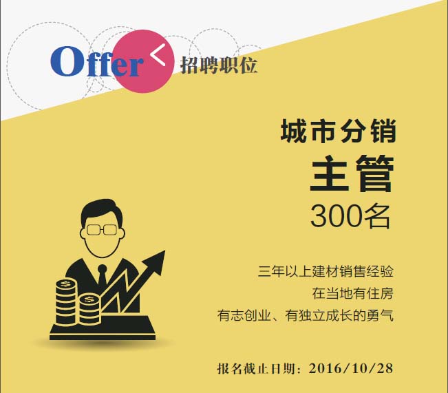 現急需大量人員在全國各地負責開發、服務當地東鵬客戶,每個城市選一名,最好是本地人,吃住在當地。職責是:利用東鵬現有經銷店面,擴充木地板銷售,推廣“全員營銷,全地面成交”活動,同時在空白區域開發獨立木地板專賣店。
