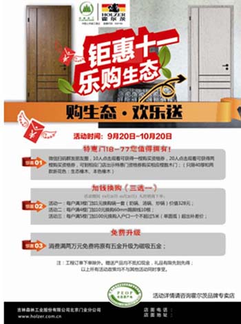 十一國慶來了,小伙伴們是不是也準備開啟假日狂歡模式了呢!是慵懶的在家無所事事,嘲笑著外面的人山人海?還是文藝的來一場說走就走的旅行?亦或是在假期繼續努力工作學習,為未來奮斗?如果讓小編選擇,小編會去參加自9月20日就已經啟動,由霍爾茨木門主辦的“鉅惠十一 樂購生態”十一大型活動,在這個假期認真的選擇一扇生態木門,也享受享受健康的生態家居生活,而且最重要的是,這次活動優惠真的太多啦!