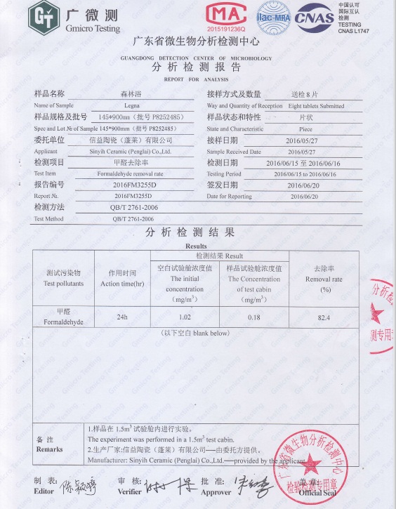冠軍磁磚瓷磚系列中,3D真石及森林浴產(chǎn)品采用“負(fù)離子專利技術(shù)”,可永久持續(xù)釋放負(fù)離子,經(jīng)國家專業(yè)檢測機(jī)構(gòu)檢測,空間負(fù)離子釋放量可達(dá)到3000±500個(gè)/cm2,人們長時(shí)間生活在這樣的環(huán)境中,有益于生命與健康。