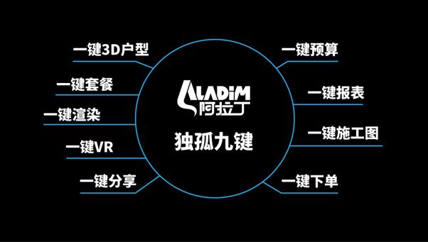 阿拉丁DIM云平臺通過打造獨孤九“鍵”的功能,一鍵出3D戶型、一鍵套餐、一鍵渲染、一鍵VR,一鍵出施工圖、一鍵出預算、一鍵出報表、一鍵分享、一鍵下單。