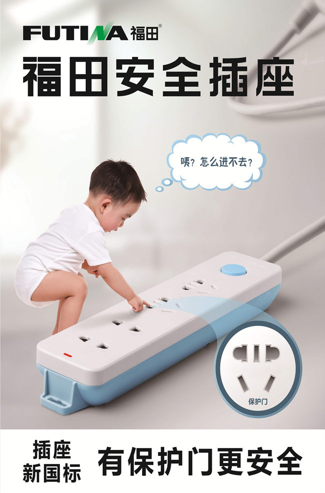 對于兒童安全接線板產品,推薦使用福田接線板,福田接線板在國標委發布前就提出有保護門更安全的理念,這款歷時3年精心打造經濟實用性接線板。福田接線板為了給廣大消費者提供更安全貼心的福田接線板,已為所有的福田接線板產品配有安全保護門,插孔只有在對應的兩級同時插入時才會完全打開,有效避免了意外觸電的情況發生,當有細小的物品掉落時,配備保護門的插座就可以將小物品阻擋在外,避免和內部的電源接觸,從而近一步減少意外的發生。