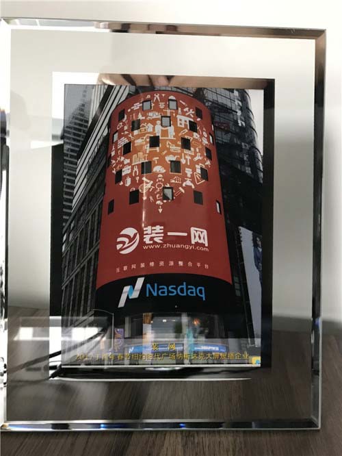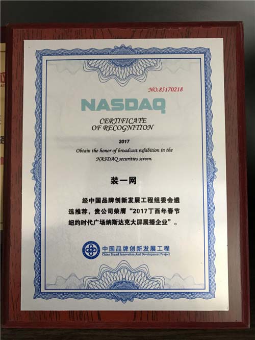 裝一網形象廣告登陸紐約時代廣場納斯達克大屏證書