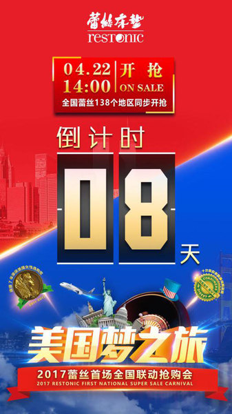 4月22日下午14:00開始,全國138個地區同步搶購,2小時結束。顧客需持有“蕾絲旅游基金卡”參加全國聯動搶購、返現及抽取美國游機會。