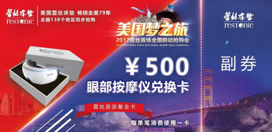 您只需在活動期間,前往全國任意一家美國蕾絲床墊的門店預存500元,即可獲得“蕾絲旅游基金卡”一張,在4月22日活動當天,您就可以憑借該卡參與我們的免費游美國抽獎活動,并無門檻免費領取一部眼部按摩儀一臺(價值1980元);與此同時如您能現場交易滿8千元,我們將立即給您返還500元現金,僅限4月22日全國前2000名交款的客戶。預存有效期為:3月21日-4月20日