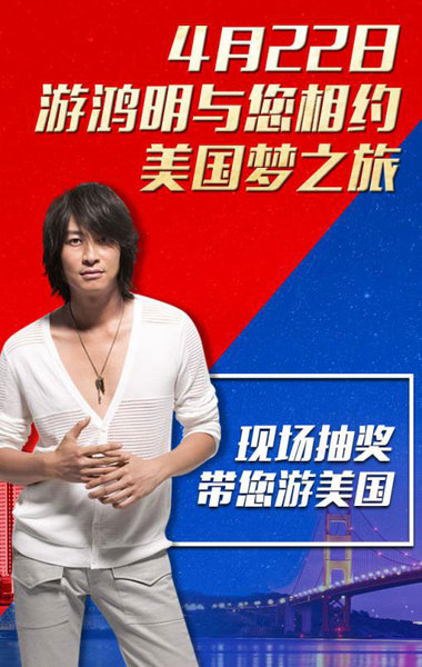 4月22日當天,全國聯動,現場直播,明星抽獎!我們將邀請到臺灣著名歌手游鴻明為大家抽取免費去美國的幸運用戶,全國5個免費美國游名額等你來拿。還有更多禮品與優惠請于4月22日與大家共同致敬夢想,筑夢前行。