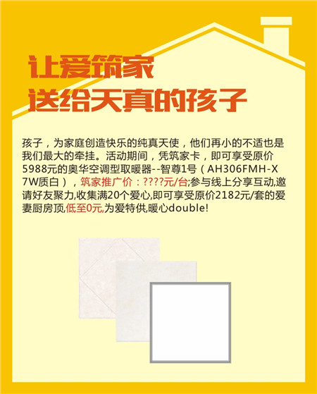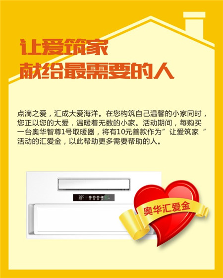 點(diǎn)滴之愛(ài),匯成大愛(ài)海洋。在您構(gòu)筑自己溫馨的小家同時(shí),您正以您的大愛(ài),溫暖著無(wú)數(shù)的小家。活動(dòng)期間,每購(gòu)買一臺(tái)奧華智尊1號(hào)取暖器,將有10元善款作為“讓愛(ài)筑家”活動(dòng)的匯愛(ài)金,以此幫助更多需要幫助的人。