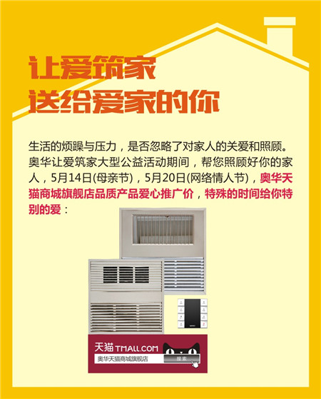 生活的煩躁與壓力,是否忽略了對(duì)家人的關(guān)愛(ài)和照顧。奧華幫你照顧好你的家人。5月14日母情節(jié)以及5月20日網(wǎng)絡(luò)情人節(jié)期間,奧華天貓旗艦店將推出三款產(chǎn)品,享受愛(ài)心特價(jià),特殊的時(shí)間給你特殊的愛(ài)。