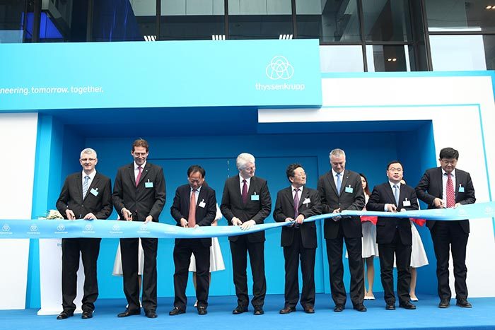 蒂森克虜伯電梯(中國)總部大樓暨研發中心揭幕 上海市松江區區長秦健和佘山鎮政府領導,中國電梯協會理事長李守林,上海電梯協會領導、特種設備檢驗機構代表、蒂森克虜伯集團董事會主席兼首席執行官海里希·赫辛根博士、蒂森克虜伯電梯董事會執行主席兼首席執行官安德烈亞斯·席勒貝克、蒂森克虜伯電梯(中國)首席執行官 約根·博樂參加了揭幕儀式。