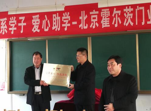 霍爾茨木門(mén)總經(jīng)理趙崇聯(lián)和牛嵐希望學(xué)校校長(zhǎng)舉行捐建揭牌儀式