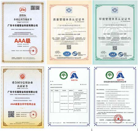 卡樂福自創立以來,不忘初心,始終秉承著“健康用水”的品牌理念,打造高端不銹鋼水管品牌,憑借著雄厚的研發實力和自主創新能力,卡樂福成功取得了國家專利32項,先后通過了ISO9001質量管理體系、ISO14001環境管理體系等多項體系認證,并獲得了廣東省涉及飲用水衛生安全產品衛生許可批件、佛山綠色建材政府采購符合性證明和“不銹鋼水管行業標準”參編單位的殊榮。
